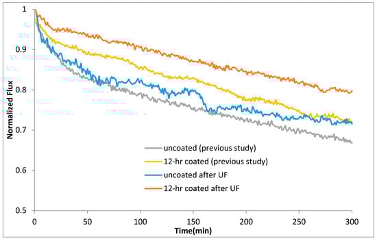 Finally, PW was treated in the FO system to examine the effect of UF pretreatment. FO was chosen as a later treatment because it effectively treated the shale oil and gas PW in our previous study [34]. In the previous study, the PW from the Permian Basin was treated in the FO system after the vacuum filtration using only 0.45 μm filters. The flux behaviors of the FO membranes in both studies were compared with each other to check the improvement. The PW used in the previous study had an average TDS of 120,000 mg/L. The PW used in the present study had an average TDS of 190,000 mg/L. Even though the TDS content of the previous PW used was almost 60% of the present one, a significant improvement after the UF pretreatment was observed. As shown in Figure 11, without the UF pretreatment, the normalized flux decreased to 66.9% after 300 min. The improvement after 12 h l-DOPA coating was not significant either. The flux was reduced to 71.9%. The 5.0% improvement was achieved after the coating. Moreover, even though there was an improvement after coating, the improved flux was not stable and the coated membrane performed the same as the uncoated one during most of the experiment time. The improvement occurred only towards the end of the experiment. However, after the UF, the fouling behavior of the FO was greatly improved. The flux was reduced to 71.5% for the uncoated one, similar to the coated membrane without the UF. After the l-DOPA coating, the reduction was less than that. The flux was reduced to 79.8%, showing a better improvement compared to the previous study. After 5 h, the flux reduction was only 20.2%, even with the PW that had very high concentration of solids. It was concluded that the improvement in the flux is most likely because of the effective pretreatment with UF. The quality of the PW should have been improved since the UF further removed the dissolved solids and organic materials present. It should also be noted that after the UF pretreatment, the FO membranes showed more stabilized flux. The findings proved that the UF had a positive effect on the flux behavior of the FO membranes.