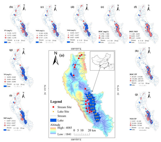 Study area and nutrient variables. (a) The distribution of sampling sites and (b–j) spatial patterns of nutrient variables in Erhai Lake and its tributaries. The map was created in ArcGIS 10.2 (http://desktop.arcgis.com/en/arcmap/) using ASTER GDEM data downloaded from the United States Geological Survey [ASTER GDEM is a product of the Ministry of Economy, Trade and Industry (METI) and the National Aeronautics and Space Administration (NASA)].