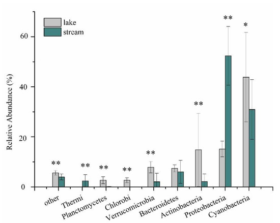 Phyla-level bacterial relative abundances in Erhai Lake and streams. Only phyla with a relative abundance > 1% in either streams or the lake are shown; “other” represents the unsigned operational taxonomic units (OTUs) and the phyla with a relative abundance < 1%. The comparison of lake and streams bacterial abundances was assessed by t-tests. ** indicates statistical significance at p < 0.01 and * indicates p < 0.05.