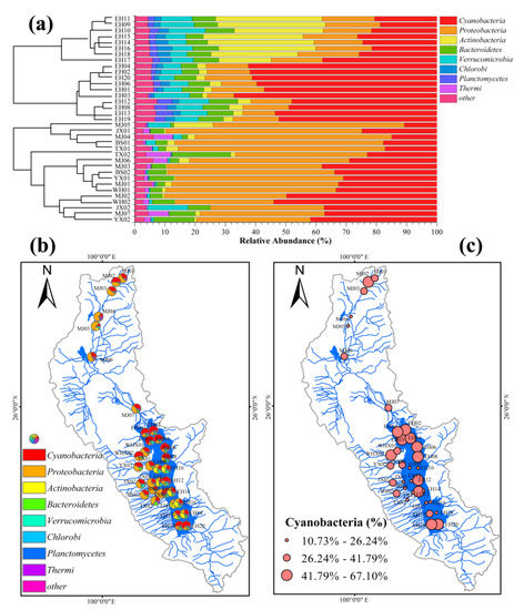 Composition of bacterial communities in Erhai Lake and streams (a) as well as the spatial variations in bacterial communities (b) and Cyanobacteria (c).