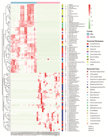 Heatmap showing the taxonomic differences of OTUs between Erhai Lake and streams based on Bray–Curtis distance. Bray–Curtis distances were calculated using relative abundances of OTUs (relative abundance > 0.1%).