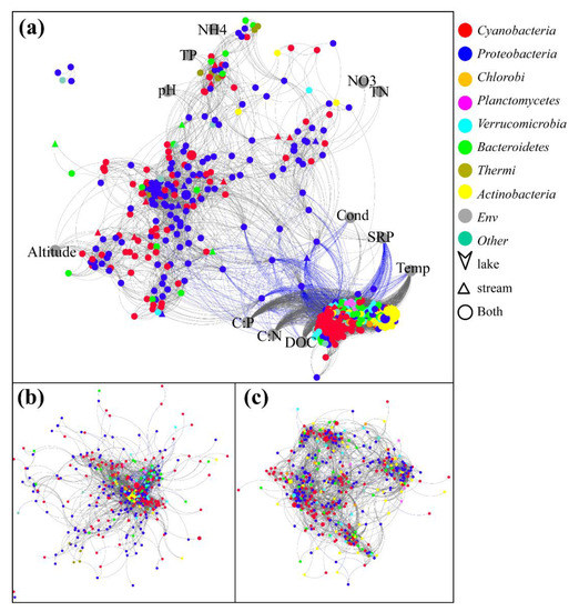 OTUs (relative abundances > 0.01%) were used to build co-occurrence networks (Figure 5, r > 0.6 or r < −0.6, p < 0.01). The integrated bacterial network contained 511 nodes (i.e., OTUs) and 12 environmental parameters with 17,129 edges (significant interactions) (Figure 5a). The lake bacterial network contained 416 nodes (i.e., OTUs) and 5898 edges (Figure 5b), and the stream bacterial network contained 435 nodes with 2808 edges (Figure 5c). In total, 97.78% inter-genus correlations were positive within the integrated bacterial network. Significant correlations were mostly concentrated within Cyanobacteria, Proteobacteria, Verrucomicrobia, and Actinobacteria phyla. The positive relationship of OTUs in the lake bacterial network was 69.2% (Figure 5b), and in the streams network, it was 100% (Figure 5c). These results suggested that lake microorganisms have more competitive relationships than stream microorganisms due to the homogeneous habitat and the limited resources in the lake. In the integrated bacterial network, Proteobacteria had the highest accumulated betweenness centrality score of 0.67. The betweenness centrality is a measure of centrality of nodes in a network based on shortest paths. The higher the betweenness centrality scores of nodes are, the more associations over the network there are. C:P had the highest accumulated betweenness centrality score (0.065), followed by SRP (0.035), Temp (0.033), and DOC (0.032). Moreover, both C:P (31.76%) and DOC (46.58%) were positively associated with nodes belonging to Cyanobacteria, while SRP (36.62%) was negatively associated with nodes belonging to Cyanobacteria.