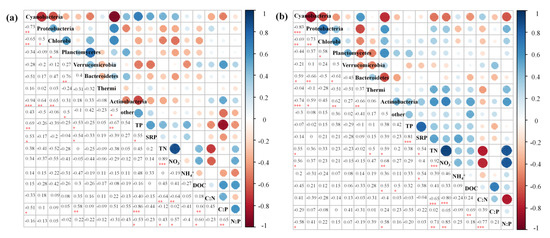 Spearman’s rank correlation between nutrients and microbes at the phyla-level in (a) Erhai Lake and (b) streams. Blue nodes indicate positive associations and red nodes negative associations. Nodes are sized and present the degree of correlations. *** indicates statistical significance at p < 0.001, ** indicates p < 0.01 and * indicates p < 0.05.