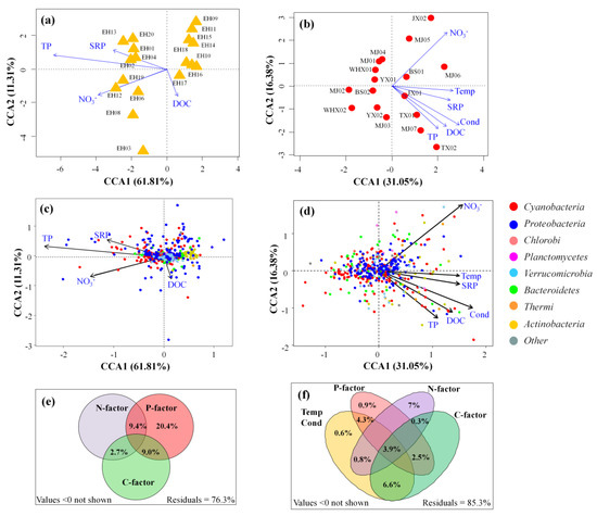 Canonical correspondence analysis (CCA) of bacterial communities and nutrient variables in Erhai Lake (a, c, and e) and streams (b, d, and f). All environmental variables had goodness of fit at the significant level p < 0.05 by envfit function. Variance partition analysis (VPA) determined the relative contributions of physicochemical factor, C-factors (DOC), N-factor (NO3−), P-factor (TP and SRP), and the interactions of these factors in Erhai Lake (e) and streams (f).