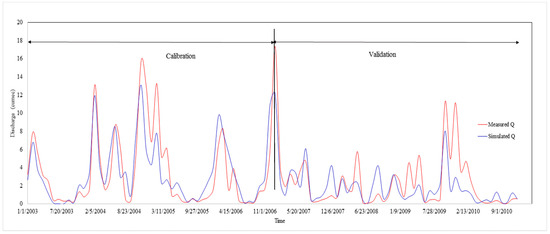 Discharge data for the Saline Bayou outlet was obtained from the United Stated Geological Survey (USGS) for 2001–2010 for calibration and validation of the model. To understand the uncertain character of the watershed, data from 2001 to 2002 were used for a warm-up period, data from 2003–2006 were used for calibration, and the remaining data were used for validation. The MapShed model was able to predict monthly flow data with good accuracy, which was shown by four performance evaluation statistics: NSE = 70%, PBIAS = 0.00, RMS = 0.55, and R2 = 0.70 for the calibration and NSE = 59%, PBIAS = 0.21, RMS = 0.64, and R2 = 0.64 for validation. Generally, model simulation is considered to be satisfactory if NSE > 0.5, RMS < 0.70, PBIAS ± 25% for stream flow [27]. Our results satisfy these constraints; therefore, MapShed performed well. Figure 2 shows the graphical representation of the calibration and validation result.