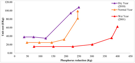 In the dry weather scenario (Table 6), at the lower level of the phosphorus reduction goal, nutrient management came out to be an effective BMP. At a 30% level of phosphorus reduction, nutrient management and ag land retirement were the two BMPs chosen. Note that in wet and normal scenarios, the only BMP selected to reduce this level of phosphorus was nutrient management. The cost to reduce 30% of the phosphorus from the baseline scenario was US$4226 in a scenario where dry weather prevailed. At this situation, nitrogen and phosphorus reduction costs per kg were US$22.54 and US$34.97, respectively. The maximum amount of phosphorus load reduction if dry weather prevailed was 41%, which costs US$169.58/kg for nitrogen and US$107.97/ kg for phosphorus. The relationship between phosphorus reduction per unit cost for all the three conditions, viz., normal, wet, and dry, are plotted in Figure 3. It is clear that phosphorus reduction cost per kg is the highest in a dry weather scenario and lowest in the wet weather scenario for all levels of phosphorus reduction.