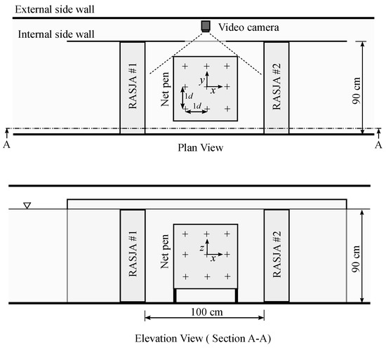 A range of pump utilization ratios were tested prior to fish testing using mean activation periods from = 0.5 s and = 4 s. These measurements were made at the origin (centroid) of the net pen, as defined by the coordinate system shown in Figure 1. The measured turbulence kinetic energy was in the range of . Preliminary fish tests showed that pump activations of s resulted in fish impact and impingement against the walls of the net pen. For this reason, the selected utilization ratio was with = 1.0 s and = 0.1 s.