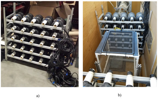 Each RASJA consisted of 25 submersible electric pumps mounted in a array, as shown in Figure 2a. The pump spacing, d, was 160 mm in both the vertical and transverse directions. Thermoplastic utility pumps manufactured by Flotech (Model FP0S3000X) were selected to provide the largest flow rate within the available power limits of the laboratory, with a rated flow rate of 3.15 L/s through a 35-mm diameter nozzle. The discharge rate of all 50 pumps was measured experimentally and had a mean of 2.74 L/s and a standard deviation of 0.08 L/s, which corresponded to a nominal jet exit velocity of 2.84 m/s. These pumps were oil free to avoid contaminating the water during fish testing. The intake to the pump is located at the opposite end of the casing from the nozzle. In this way, the pump intake and outlet are along the same axis and their proximity approximates a synthetic jet configuration. The switching of the pump operation was controlled using LabVIEW (National Instruments) and triggered using a Measurement Computing USB-DIO96 digital output card.
