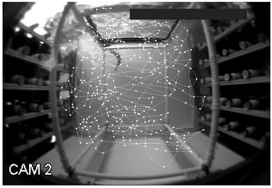 Fish track of a representative 2-min turbulence test captured from surveillance video footage. The location of the center of the fish, recorded every 0.3 s, is indicated with a white circle and the interpolated fish track is indicated with a dashed line.