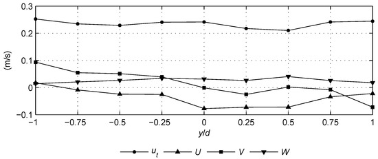 Transect of turbulent velocity, , and mean velocity components (U, V and W) at , , .