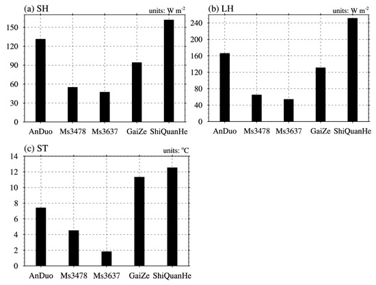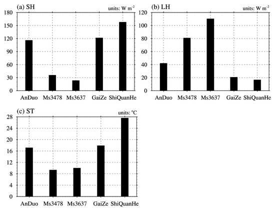 Notably, ST (i.e., soil temperature for the top 10 cm soil layer) is not a direct output of the CoLM model. As the depth of the first three soil layers in the CoLM was 9.06 cm, ST in this study was determined to be the weighted average of the soil temperature in the first three soil layers according to the soil layer thicknesses. Figure 2 shows the simulated SH, LH and ST averaged during the study periods for different TP sites. Additionally, due to the limited observations, evaluations of the CoLM model’s ability to simulate surface heat fluxes at some of the five study sites are provided in the Supplementary Material. As model parameters associated with soil and vegetation are not available from observations, simulations are conducted by running the CoLM model with the default values of these model parameters. It is well known that errors exist in the model default parameters, which are usually acquired from other variables based on theoretical or empirical considerations or prescribed by look-up tables. Therefore, errors inevitably appear in the simulated surface heat fluxes even though the model parameterizations are reasonable. By comparing observations and simulations for SH from three observational sites, Ms3637, Ms3478 and AnDuo, it can be seen that although peak values in the afternoon at the Ms3637 and Ms3478 sites are not simulated well and SH in the evening is overestimated at the AnDuo site, the diurnal cycle of SH is well captured (see Figure S1 in the Supplementary Material). For LH, similar to SH at Ms3478 and AnDuo, the diurnal cycle is well simulated (see Figure S2 in the Supplementary Material). At the AnDuo site, the peak values are not well simulated. These results at least justify that the CoLM model can capture the surface heat fluxes in terms of the diurnal cycle. Generally, the modeling errors for SH and LH can be attributed to improper model parametrizations; however, errors arising from model parameters cannot be excluded. Researches have shown that specification of the default parameters may cause significant errors in the surface energy budget [35,46,47]. Our study will focus on the simulation errors caused by model parameters. Modeling errors due to model parameterizations are not in the scope of this study.