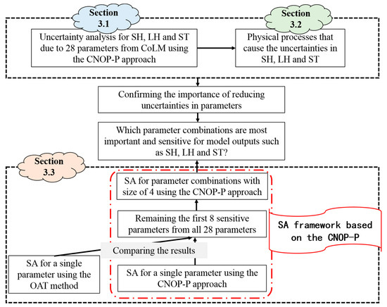 In summary, to achieve the two objectives proposed in the introduction section, the flow chart of this study is described in Figure 3. First, the influences of uncertainties from the 28 parameters of CoLM on the simulated SH, LH and ST were quantified using the CNOP-P approach, which would be shown in Section 3.1. Then, the physical processes that cause the uncertainties in SH, LH and ST would be analyzed (Section 3.2). The results from the above two sections can provide evidence for the necessity and importance of reducing uncertainties in the model parameters by means of data assimilation or calibration methods. Finally, to identify parameters that are crucial for model performance, the sensitivity analysis is conducted step by step using the CNOP-P approach, and the most important and sensitive parameter combinations will be identified (Section 3.3). Additionally, it should be noted that the OAT method is only applied to conduct a single parameter sensitivity analysis for ranking the sensitivities of parameters, which would serve as a comparison and further confirm the results from the sensitivity analysis for a single parameter using the CNOP-P approach. When the sensitivities of parameter combinations are identified, only the CNOP-P approach is employed.