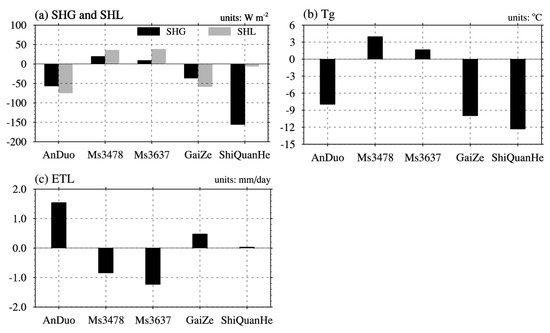 Figure 5 shows the changes in SHG, SHL, Tg and ETL under CNOP-Ps relative to their respective reference states when SH was chosen as the objective state variable in the CNOP-P approach. At the AnDuo and GaiZe sites, changes in SHG and SHL jointly resulted in variations in SH (Figure 5a). For the two sites, Tg was greatly reduced (Figure 5b), contributing to the reduction in temperature gradients between the ground surface and canopy and then the decrease in SHG. Similarly, the augmentation of ETL indicated a decrease in leaf temperature (Figure 5c), which was conducive to the reduction in temperature gradients between the leaves and canopy and then a decrease in SHL. In general, at the AnDuo and GaiZe sites, the uncertainties in SH due to CNOP-Ps were attributed to the dramatic reduction in the ground surface temperature and decrease in the leaf temperature related to the enhanced evapotranspiration from leaves. At the Ms3478 and Ms3637 sites, changes in SH largely originated from variations in SHL (Figure 5a), which were mainly caused by the increased temperature gradients between leaves and canopy associated with the reduced ETL (Figure 5c). For the ShiQuanHe site, changes in SH were dominated by the changes in SHG, which were caused by the reduced temperature gradients between the ground surface and canopy due to the strongly decreased Tg (Figure 5b).