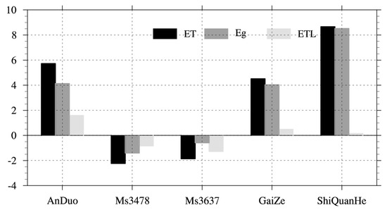 When physical processes accounting for the uncertainties in LH under CNOP-Ps were explored, ET, Eg and ETL were analyzed. The changes in the above three variables due to CNOP-Ps are shown in Figure 6. At different sites, the change signs of LH were the same as those for ET. At the AnDuo, Ms3478, GaiZe and ShiQuanHe sites, changes in ET largely resulted from variations in Eg. Furthermore, at the AnDuo, GaiZe and ShiQuanHe sites, the enhanced Eg primarily contributed to the uncertainties in LH, while at the Ms3478 site, the restrained Eg mainly led to the changes in LH. However, at the Ms3637 site, the inhibited ETL mainly contributed to the variations in LH.