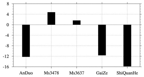 As the changes in ST were determined by GHF, CNOP-Ps altered the ST mainly by influencing GHF. In Figure 7, changes in GHF under CNOP-Ps were exhibited. The change signs of ST under CNOP-Ps were the same as those for GHF. At the AnDuo, GaiZe and ShiQuanHe sites, the reductions in GHF indicated that less heat could be absorbed by the surface soil, thus decreasing ST. Furthermore, at the Ms3478 and Ms3637 sites, the increased GHF provided more heat flux for warming the surface soil, which is conductive to the increase in ST.