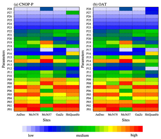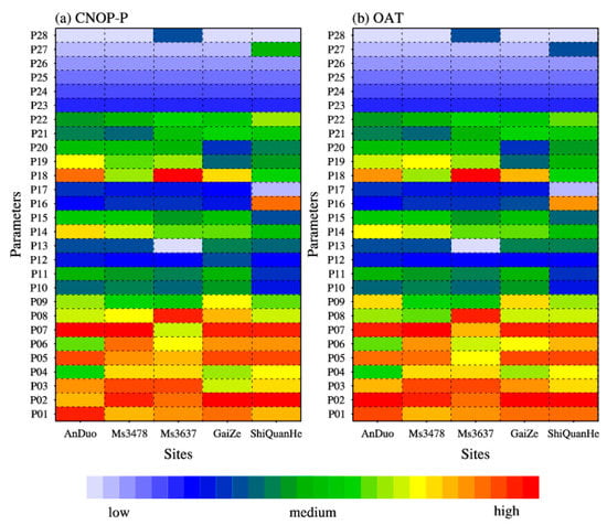 In the sensitivity analysis framework based on the CNOP-P method, after determining the information about the selected parameters, the subsequent step was to conduct a sensitivity analysis for a single parameter. Figure 8a shows the results of a single parameter sensitivity analysis for SH using the CNOP-P approach. At all sites, except the Ms3637 site, sensitivities of P01 (i.e., the porosity of the upper soil layer), P02 (i.e., the porosity of the lower soil layer) and P07 (i.e., the saturated hydraulic conductivity of the upper soil layer) always ranked as the top five. The OAT method was also used to conduct a single parameter sensitivity analysis for SH, and the results also revealed the similar importance and sensitivity of P01, P02 and P07 (Figure 8b). In the Clapp and Hornberger empirical formulas [63] applied by the CoLM model, P01 and P02 were used to obtain the soil hydraulic conductivity and matric potential, both of which are key factors influencing the simulation of soil moisture. In addition, the formula of hydraulic conductivity also depends on the saturated hydraulic conductivity. As the simulation of SH is closely related to the modeled soil moisture [65], the three parameters P01, P02 and P07 could alter the soil moisture through soil hydraulic conductivity and matric potential, and thus had a significant influence on SH. This is consistent with the findings of our previous research [66], which revealed that porosity and saturated hydraulic conductivity were important and sensitive parameters for surface soil moisture modeling on the Tibetan Plateau.