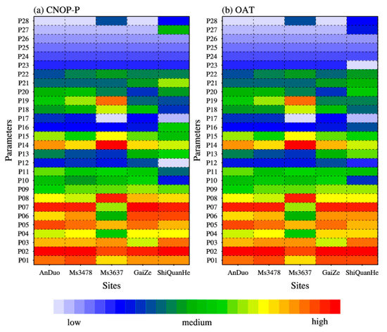 For LH, the results of a single parameter sensitivity analysis for LH using the CNOP-P approach also addressed the important and sensitive roles of P01, P02 and P07 (ranking as the top five) at all sites except the Ms3637 site, similar to the results for SH (Figure 9a). In addition, the OAT method for LH confirmed this point (Figure 9b). Considering that both soil moisture and SH are strongly linked to LH [65], it is physically reasonable that perturbations to P01, P02 and P07 could greatly affect LH.