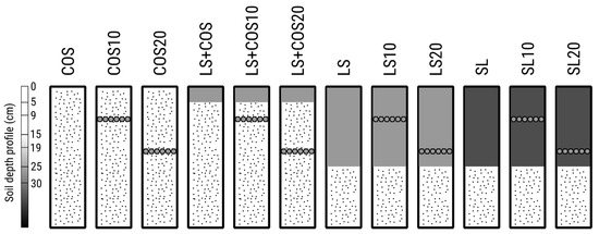 Soil profiles were prepared to represent those designed and used in environmental engineering as a topsoil layer or agriculture with respect to the content of organic matter. Three samples were prepared for every type of examined soil profile. One sample was a control and two samples were with a WAG treatment placed at different depths in each sample. Profiles were named according to the type of soil used (COS—coarse sand, LS—loamy sand, SL—sandy loam, and LS+COS—loamy sand+ coarse sand). In the case of the samples with the WAG treatment, a number of 10 or 20 was added to the name, relating to the point depth of the WAG placement in the sample, with 10 for a 10 cm depth and 20 for a 20 cm depth for a placement under the top of the soil surface. For better illustration, the soil profiles used are shown in Figure 2.