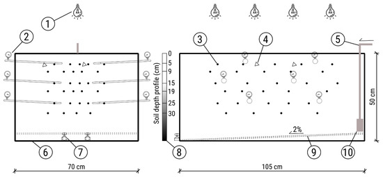 Test stand scheme in two side views with an illustration of the sensor placement positions. Description of numbered positions: 1—heating lamps, 2—tensiometer for soil matric potential, 3—soil moisture content sensor, 4—soil temperature sensor, 5—irrigation system, 6—container, 7—drainage valve, 8—soil depth profile scale, 9—3 cm thick drainage mat with 2% inclination, 10—watering buffer.