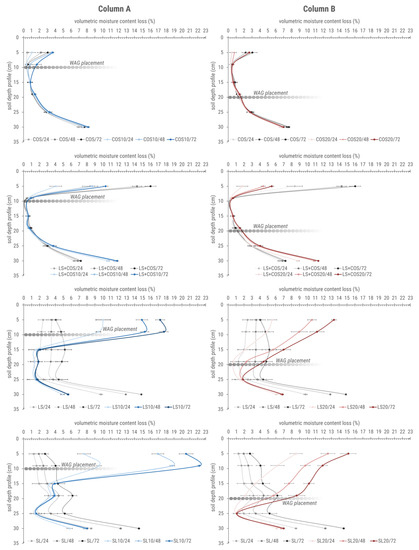 Mean moisture content loss in soil profiles at various depths. Examined samples are presented in a 24-h-long time step described in the legend by the number of hours after a slash. Types of examined soil profiles are described in the legend by use with soil name abbreviation. More detailed information about abbreviations is available in Figure 2. In both columns, control samples are presented in shades of black. Additionally, in column A, the samples with the water absorbing geocomposite (WAG) placed at a 10 cm depth are presented (shades of blue) and in column B, the samples with the WAG placed at a 20 cm depth (shades of red) are presented. The mean of three repetitions of the measurement and error bars for standard error of the mean are presented.