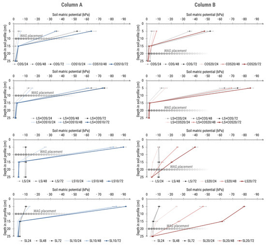 Soil matric potential. Examined samples are presented in a 24-h-long time step described in the legend by the number of hours after a slash. Types of examined soil profiles are described in the legend with soil name abbreviation. More detailed information about abbreviations is available in Figure 2. In both columns, control samples are presented in shades of black. Additionally, in column A, the samples with the water absorbing geocomposite (WAG) placed at a 10 cm depth are presented (shades of blue) and in column B, the samples with the WAG placed at a 20 cm depth (shades of red) are presented. The mean of three repetitions of the measurement and error bars for standard error of the mean are presented.