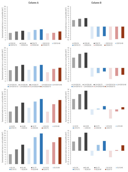 Summarized water losses in soil profiles in reference to the time step. Column A presents the samples without taking into account the water retained in the water absorbing geocomposite (WAG). In column B, the water retained in the WAG has been included. Take note that the negative values in column B mean a surplus in the water budget of the examined soil profile. Examined samples are presented in a 24-h-long time step described in the legend by the number of hours after a slash. Types of examined soil profiles are described in the legend with soil name abbreviation. More detailed information about abbreviations is available in Figure 2. In both columns, control samples are presented in shades of black, samples with the WAG placed at a 10 cm depth are presented in shades of blue, and the samples with the WAG placed at a 20 cm depth are shown in shades of red.