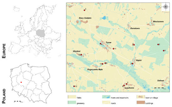 Forest ponds (Nos. 1 and 2) were in the planted forests: Pond No. 1—deciduous forest, and Pond No. 2—coniferous forest. Pond No. 1 was a natural reservoir, while Pond No. 2 was created in the 1990s. Field ponds (Nos. 3, 5, 9, 10, 11, 12) were all natural reservoirs with the exception of No. 9, which was created by the Polish Academy of Sciences for scientific purposes in 1995. Pond No. 3—surrounded by fields, cultivation of maize, fertilized organically and by minerals. Pond No. 5—surrounded by fields, rye, and wheat cultivation, fertilized organically and by minerals. Pond No. 9—surrounded by meadow, field, and a paved road; rye, wheat, and rape cultivation; fertilized organically and by minerals. Pond No. 10—surrounded by fields; rye cultivation; fertilized organically and by minerals. Pond No. 11—surrounded by fields and a meadow; cultivation of wheat and rape; fertilized organically and by minerals. Pond No. 12—surrounded by fields; cultivation of wheat and rape; fertilized organically and by minerals. Village ponds (Nos. 4, 6, 7, 8, and 13) were ponds created in the villages, without drainage, with the exception of No. 4, which was a natural pond. No wastewater was supplied to any pond and no wastewater was collected. Humans affected none of the ponds directly (e.g., fishing). Pond No. 4—surrounded by an old park where deciduous trees grow. Pond No. 6—surrounded by roads and meadows. Ponds Nos. 7, 8 and 13—located in the center of the village, surrounded by buildings and roads.