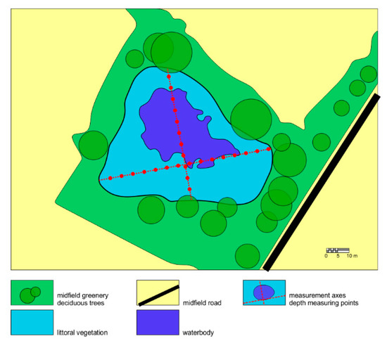 The research spanned a period of ten years (2008–2018), with measurements made every second year. The surface of the studied ponds was measured by a qualified surveyor using the Pentax R-1500N (TI Asahi Co., Ltd., Saitama, Japan) total station theodolite with TopoLite software (TI Asahi Co., Ltd., Saitama, Japan), and mean depth was measured by a depth pole (Figure 2).