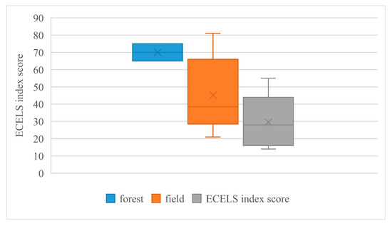 Figure 3 presents the ranges of ECELS values for ponds located in areas near forests, fields and villages. According to the analysis, the highest values (good and moderate) were characteristic of ponds located in the forest. Village ponds, on the other hand, corresponded to poor and bad levels of the ECELS indicator. The low scores were associated with components related to human activity around the ponds and the lack of submerged and floating macrophytes (Table 2).