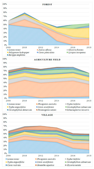 Macrophytes occupied various surface areas in the researched ponds (Figure 4). Forest ponds were occupied by macrophytes to the smallest extent and had the smallest share of flora species associated with the aquatic environment. Lemna minor L. was a dominating species at the beginning of the research period. However, in the last two years of the study, the largest increase of surface area was found for Juncus effusus L. and Polygonum hydropiper L. A significantly higher percentage of macrophytes’ surface area coverage was found in the case of agriculture ponds, where Phragmites australis (Cav.) Trin. ex Steud predominated. Village ponds were characterized by a decrease of Lemna minor L. surface area coverage and an increase in the area occupied mainly by two species: Phragmites australis (Cav.) Trin. ex Steud and Ceratophyllum submersum L.