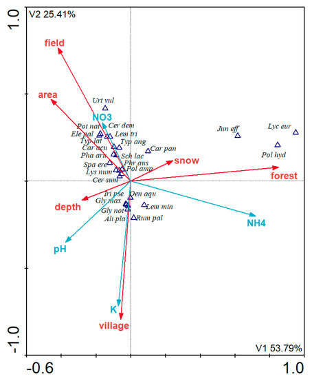 CCA analysis (n = 234) depicting the dependence between the macrophytes (Ali pla—Alisma plantago-aquatica L.; Car acu—Carex acutiformis L.; Car pan—Carex paniculata L.; Car ros—Carex rostrata Stokes; Cer dem—Ceratophyllum demersum L.; Cer sum—Ceratophyllum submersum L.; Ele pal—Eleocharis palustris (L. Roem. & Schult.); Gly flu—Glyceria fluitans (L.) R. Br.; Gly max—Glyceria maxima (Hartm.) Holmb.; Gly not—Glyceria notata Chevall.; Iri pse—Iris pseudacorus L.; Jun eff—Juncus effusus L.; Lem min—Lemna minor L.; Lem tri—Lemna trisulca L.; Lyc eur—Lycopus europaeus L.; Lys num—Lysimachia nummularia L.; Oen aqu—Oenanthe aquatica (L.) Poir.; Pha aru—Phalaris arundinacea L.; Phr aus—Phragmites australis (Cav.) Trin. ex Steud; Pol amp—Polygonum amphibium L.; Pol hyd—Polygonum hydropiper L.; Pot nat—Potamogeton natans L.; Ror amp—Rorippa amphibia (L.) Besser; Rum pal—Rumex palustris Sm.; Sch lac—Schoenoplectus lacustris (L.) Palla; Spa ere—Sparganium erectum L. emend. Rchb. s. str.; Typ ang—Typha angustifolia L.; Typ lat—Typha latifolia L.; Urt vul—Utricularia vulgaris L.) and environmental/physicochemical variables.