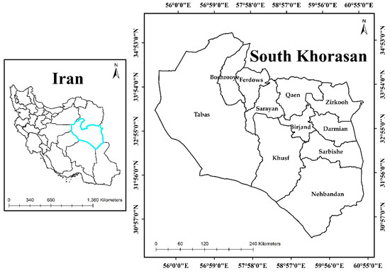 South Khorasan, the third biggest province by 95,385 square km, is located in the east of Iran and lies between 30°15’ N to 34°03’ N latitudes and 57°43 E to 61°04’ E longitudes. The province includes 11 counties: Birjand, Boshrooye, Darmian, Ferdows, Khusf, Nehbandan, Qaen, Sarayan, Sarbishe, Tabsa, and Zirkuh as shown in Figure 1. The climate is generally arid with a dry winter and hot summer by a temperature ranging from −13.57 °C in winter to 46.83 °C in summer [31]. Annual precipitation varies spatially with a minimum of 89 mm in Tabas to a maximum of 186 mm in Qaen. Most of the rainfall occurs from January to April. Due to the province’s proximity to one of the hottest deserts in the world (Dasht-e-Lut), its relative humidity is low and limited to between 10% and 58%. Additionally, the evapotranspiration rate is considerably high due to the north-to-south wind speed of up to 6.5 m/s.
