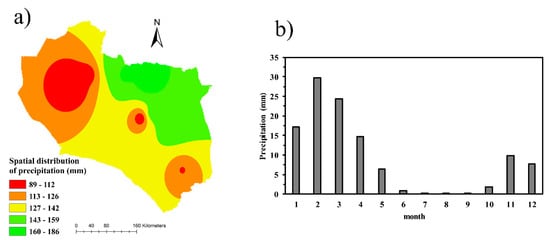 Spatial (a) and temporal (b) distribution of annual rainfall in South Khorasan.