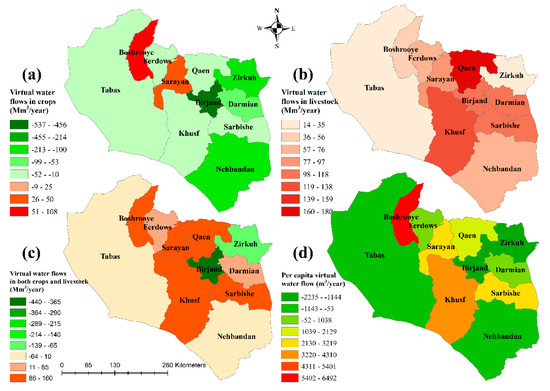 Figure 5d indicates per capita virtual water flow, which represents the virtual water flow intensity of each county. Boshrooye, for example, with 6492 m3/year, has the largest per capita virtual water flow due to its intensive agriculture and small population. Birjand and Zirkuh, on the other hand, have the most significant volume of per capita virtual water imports.