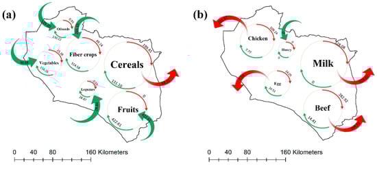 Virtual water flows of each county are calculated based on the amount of food transferred and using the virtual water concept. As the food transfer data in the region is not available for each county, the methodology described in Liu et al. [38] is applied to measure the food transfer amounts. In this approach, the agricultural products (i.e., crops and animal products) would be exported/imported if the amount of production is more/less than consumption in each county. For this aim, 10-year average data of both production and consumption are used to distinguish between exporting and importing counties. Then, interregional virtual water flows within the province is measured using Equation (11):