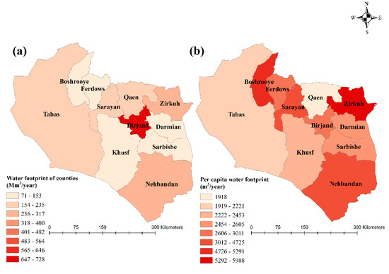 Using the volumes of virtual water trade in agricultural productions as indirect water consumption and in combination with domestic water use as direct water consumption, the water footprint of each county can be measured (Equation (12)). From the sustainability point of view, all counties should be dependent on virtual water import, mainly due to their limited green (i.e., rainfall) and blue (i.e., irrigation) water resources [7]. The total water footprint and per capita water footprint of counties are presented in Figure 7. The most populous county—Birjand—has the greatest water footprint of about 728 Mm3 per year, followed by Nehbandan and Zirkuh with 266 and 240 Mm3 per year, respectively. Khusf, with only 71 Mm3 per year, recorded the lowest water footprint within the region. Iran’s water footprint is recorded as 102 Gm3 per year and has an average per capita water footprint of 1624 m3 [17]. In comparison, South Khorasan, as a whole, accounts for 2.28% of Iran’s water footprint. The annual per capita water footprint within the study region (3486 m3 per year) is nearly 114% more than the country, Iran (1624 m3 per year). In addition, the annual per capita water footprint within the study region varies in a wide range from 1918 m3 in Qaen to 5988 m3 in Zirkuh. This high level of per capita water footprint is largely due to the aridity of the region, which substantially contributes to a higher virtual water content of agricultural products.