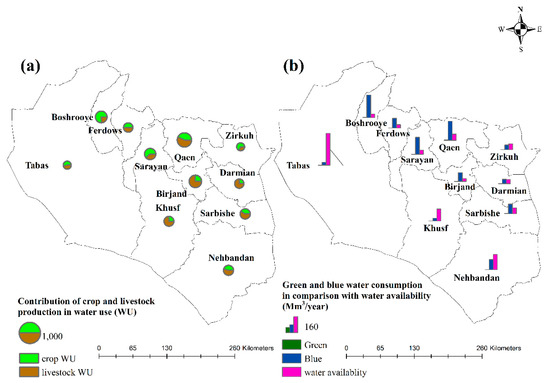 The region has an agriculture-based economy, and all the counties produce both crops and animal products extensively in comparison with their limited water endowments. Figure 8a compares the fractional contribution of different types of commodities in the agricultural productions. Intensive agricultural practices within the region have exerted enormous pressure on groundwater aquifers as the primary source of blue water resources in this arid region. The proportion of each source of water (i.e., green and blue), as well as the water availability of each county are presented in Figure 8b. According to the presented results, the region is overexploiting its blue water resources in crop production using withdrawal to availability (WTA) ratio. The readers are referred to Qasemipour and Abbasi [7] for more details on this issue.