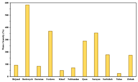 Intensive agriculture, high virtual water contents of both crops and livestock, great reliance on blue water supplies, and insisting on complete self-sufficiency in producing foodstuffs has negatively affects the sustainability of the region. The water scarcity of the region is far beyond the scope of sustainability (Figure 9). The average water scarcity of the region is 206.06%, which means that the exploitation of groundwater aquifers is much higher than annual groundwater recharge.