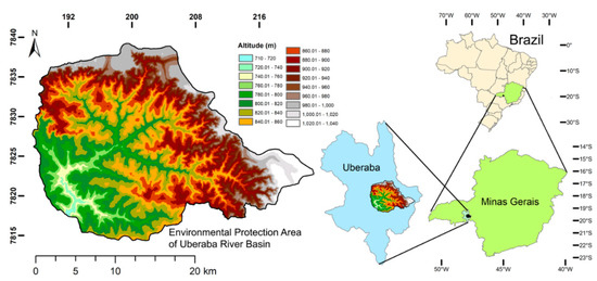 Location of the Environmental Protection Area of Uberaba River Basin in the Uberaba Municipality, State of Minas Gerais, and Brazil. Adapted from Valera et al. [15].