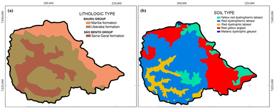 Geology (a) and soils (b) in the Environmental Protection Area of Uberaba River Basin. The soil map was adapted from Siqueira et al. [44].