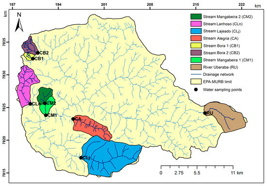 The studied sites comprised eight small to medium sub-basins selected within the EPA-MURB (Figure 4), with areas ranging from 136.3 hectares (Borá 1 sub-basin) and 3764 hectares (Lajeado sub-basin). The distribution of main land uses or covers is summarized in Table 1. In all cases the catchments were mostly used for agriculture, namely sugar cane plantations, as well as natural or managed (used for the grazing of domestic livestock) pastures. The use for agriculture (“A” column in Table 1) represents 56.7% (Borá 2 sub-basin) to 88.8% (Borá 2 sub-basin) of the catchment areas, and therefore, they can be considered basins with significant anthropogenic influence. Besides the use for agriculture, the eight catchments are substantially covered with native (Cerrado) and managed (eucalyptus) forests (“F” column), with proportions to the agriculture use (“F/A” column) ranging from 0.1 to 0.7. The other uses or covers (“Other” column) comprise the rural dwellings, water bodies (lakes and reservoirs), roads, orchards and areas used for rainfed or irrigated corps. The riparian buffers marginal to the watercourses (“L” column) were characterized by quite different widths: On average and approximately, 15 m in the Alegria, Lageado and Mangabeira 1 sub-basins; 30 m in the Borá 1, Mangabeira 2 and Uberaba sub-basins; and 50 m in the Borá 2 and Lanhoso sub-basins. The water samples were collected at the sub-basins’ outlets.