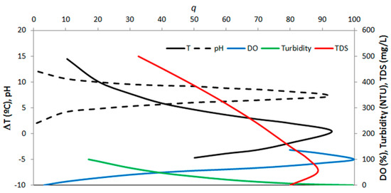 where 0 ≤ IWQ ≤ 100, qi is the quality of ith parameter obtained from standardization of the measured values into a 0–100 range, wi is the weight of ith parameter, which varies in the 0 ≤ wi ≤ 1 interval as a function of its importance to the overall quality, and n is the total number of parameters. This IWQ evaluates water quality on the basis of nine parameters (n = 9), including water temperature, pH, dissolved oxygen, turbidity, total dissolved solids, biochemical oxygen demand, fecal coliforms, total nitrogen and total phosphorus. Data may be lacking for some parameters, but the index can still be calculated using the available data and adjusting the weights to different values. In the present study, the calculus of IWQ was based on five parameters (n = 5), namely the first five from the CETESB list, while the weights were set to—0.10 (water temperature); 0.21 (pH); 0.17 (turbidity); 0.2 (dissolved oxygen); 0.17 (total dissolved solids), as proposed in [45]. The transformation of measured parameters into q scores (Equation (1)) is based on standardization curves, which are portrayed in Figure 5 for the selected parameters. The average of each parameter in the studied catchments, as well as the corresponding IWQ values, are depicted in Table 3.