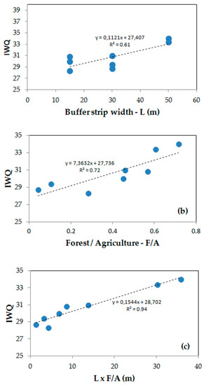 IWQ scatter plots. (a) This variable is projected as a function of buffer strip width (L), (b,c) as a function of ratio forest over agriculture (F/A) and interaction term L × F/A, respectively. The data used to draw the plots are depicted in Table 1 (L, F/A and L × F/A) and 3 (IWQ).