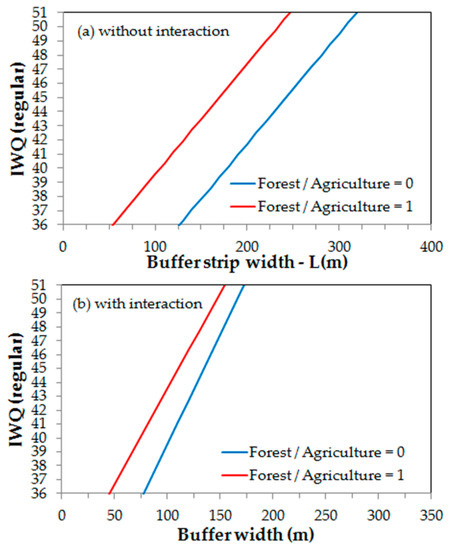 where Equation (4a) represents the relationship without considering the interaction between L and F/A and Equation (4b) the case where this interaction is accounted for. The graphical representation of Equation (4a,b) are illustrated in Figure 7a,b. Figure 7a portrays a couple of parallel lines describing the evolution of IWQ as a function of L, for the extreme values of F/A (0 and 1). The lines are parallel because the model predicts no interaction [67]. The buffer strip widths required to ensure a regular water quality in the studied sub-basins (36 < IWQ ≤ 51) range from L = 130 m to L = 310 m, when F/A = 0, and from L = 60 m to L = 250 m when F/A = 1. These results change considerably when the interaction term is incorporated in the regression analysis, as demonstrated in Figure 7b. Now, the non-parallel lines indicate much smaller L ranges to attain the regular water quality, namely L = 75–175 m for F/A = 0, and L = 45–155 m for F/A = 1. The consequences for planning of adopting one or the other model are evident, either for the planning of landscape composition or buffer strip widths. The interaction model may be more realistic because of its larger R2 and interaction term significance.