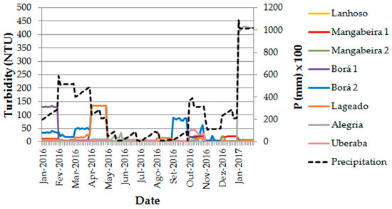 Besides the infiltration capacity issue, it is worth to explore the potential influence of rainfall intensity in the interaction effect, considered relevant in areas where annual climate fluctuations are stronger, including the tropical regions [73,74]. Turbidity is extremely sensitive to rainfall intensity and played a dominant role in the regression analyses of individual parameters (Table 5). The turbidity records of all studied catchments (see Supplementary Materials) are represented graphically in Figure 8, along with the corresponding daily precipitation record. It is evident the response of turbidity to larger values of daily precipitation, namely in the Borá 1 (January 2016), Lageado (April 2016) and Alegria (January 2017) catchments. A close inspection of Table 1 reveals that these catchments are among those with a lower L × F/A value. There are, however, striking exceptions: The Uberaba River catchment has the lowest L × F/A value (1.3 m), but barely responds to precipitation events; the Borá 2 catchment turbidity peak in September 2016 is not justified by a precipitation event. It is worth recalling, however, that the control of turbidity in streams is not only determined by the studied parameters, namely F/A, L, infiltration capacity and flow convergence related to L × F/A, and rainfall intensity. Topography is also a key parameter [75], which was not addressed in this study because the focus here was put on the interaction between landscape composition and buffer strip widths. We believe topography would help to explain the Uberaba River exception. This is a headwater catchment located in a relatively flat area (compare Figure 4 with Figure 1). These areas are well acquainted with retain sediments because they generate lower overland flow velocity while maximizing infiltration and particle deposition, in opposition to steep slope areas [76].