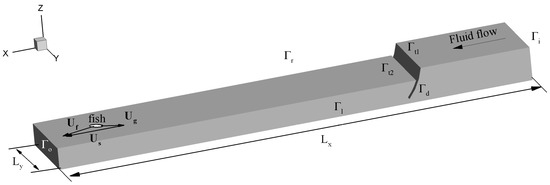 Schematic model structure of a channel. The major surfaces of the computational region are: are the inflow and outflow surfaces; are left, right and top surfaces; is the surface of the gate, is the surface of the bottom (not shown). Vectors and are fluid velocity, ground velocity of a fish, and swimming speed of the fish, respectively.