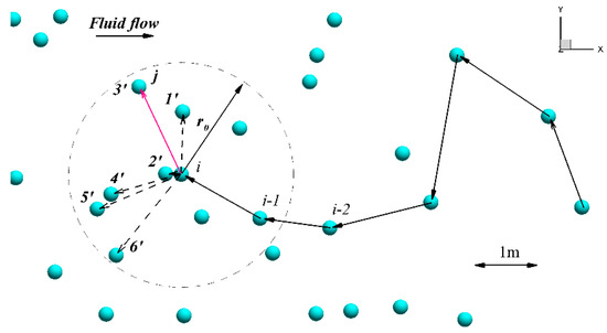This sketch explains the algorithm of upstream fish swimming (to simplify, we show a 2D Figure, which does not affect the generality of the 3D approach). Solid spheres are nodes of the fluid mesh generated by the ANSYS Mesh Editor. The current position of fish is a point ; is the radius of the searching algorithm; are points of a possible new fish location (i.e., neighboring nodes within the searching algorithm radius and positioned upstream of the current fish position) where the increment of fatigue is estimated, and is the new position of the fish, i.e., here, movement—red vector from point i to point that had caused the least fatigue. If for all directions , the next node is selected randomly.