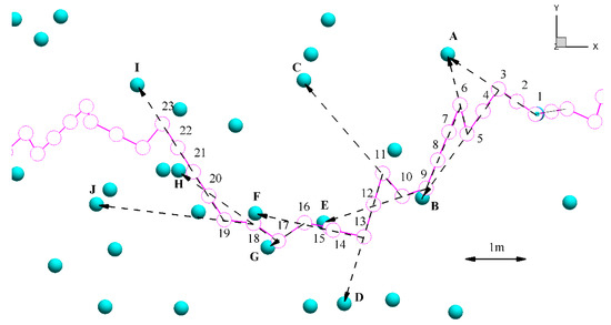 Movement path of a fish using the modified algorithm. Numbers (pink circles) #1–#23 are indicators of fish positions. Letters A–J (light blue spheres) indicate nodes of the computational mesh. Dashed arrows indicate the direction of movement, and point towards the computational node used to calculate fluid, ground and swimming velocity.