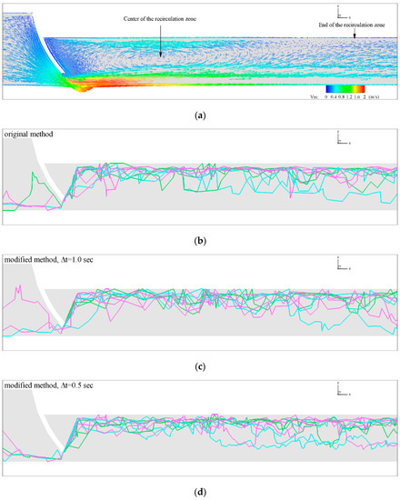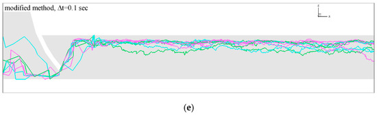 To demonstrate the utility of the modified algorithm, comparative simulations of fish swimming in a model channel for the original CFD-AB and modified approaches are shown in Figure 6. The flow field contains a large recirculation zone downstream of the tainter gate (Figure 6a). Trajectories displayed in Figure 6b–e demonstrate similar pathways across all algorithm settings, but the modified approach using a step size of 0.1 s produces a pathway with less variability and reduced direction changes. Pathway solutions for the original and modified algorithm were obtained using the same parameters and with a gradually decreasing time step. As a result of the smoother pathway, fish swimming trajectories calculated by the modified algorithm also reduce the required energy expended. The reason is that with a smaller time step, fish adjust to the flow and try to swim into the recirculation zone by using vortex energy (Figure 6c–e). Fish swim without spending energy within the recirculation zone because the water velocity direction coincides with the fish trajectory.