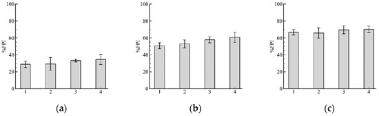 Results of fish passage index (%FPI) with varying: (a) ; (b) and (c) . The numbers of the abscissa indicate bars 1, 2, 3 and 4, where 1 refers to the original algorithm, 2, 3 and 4 refer to the modified algorithm with , , and s, respectively. These results clearly show that increasing the initial radius in the searching algorithm leads to increases to %FPI, and hence to errors in the estimation of the fish passage.